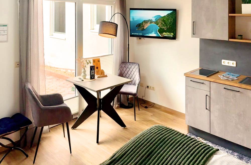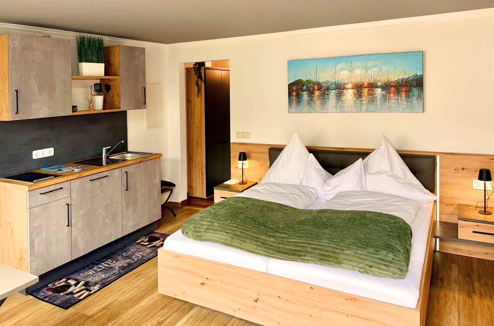 The Heubach Suite offers plenty of space to arrive and feel at home on approx. 41 m². The separate living and sleeping area with king-size bed (180 x 200 cm) creates space for rest and retreat, while the cosy living area invites you to relax. A comfortable bathroom with a spacious walk-in shower and a fully equipped kitchen round off the offer. Ideal for guests who like it particularly comfortable.