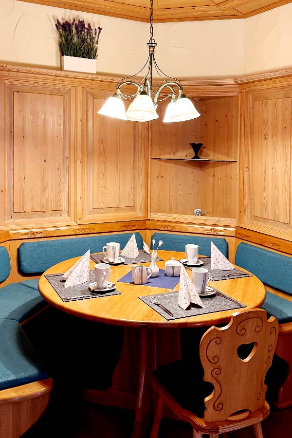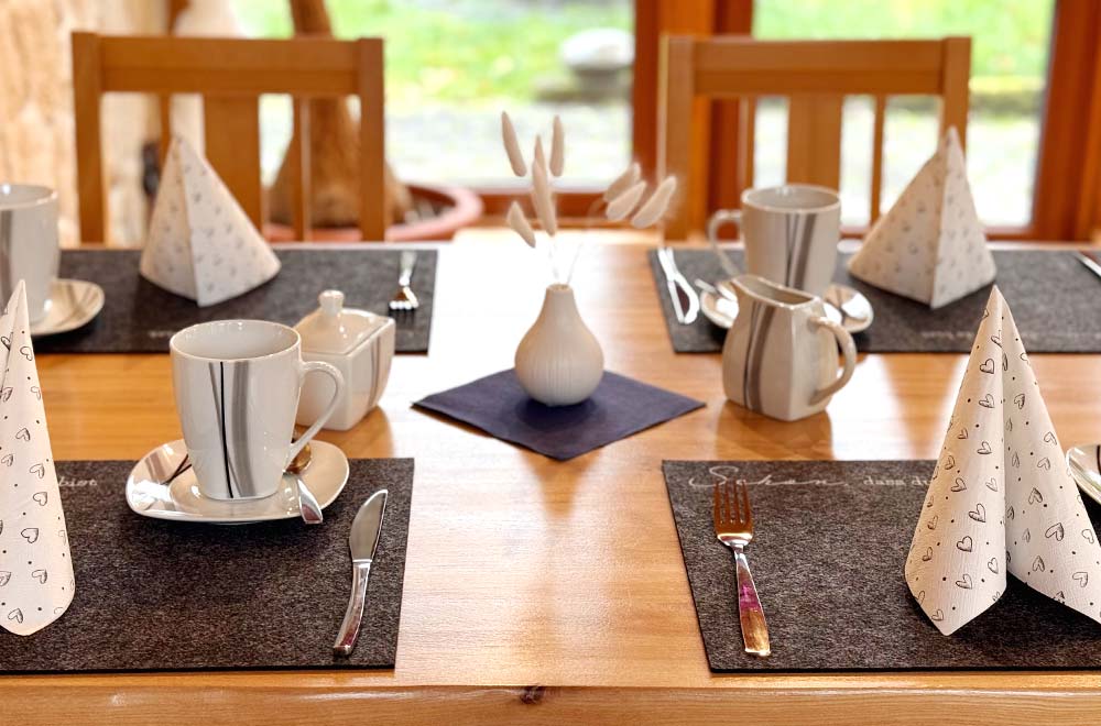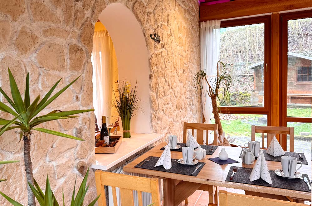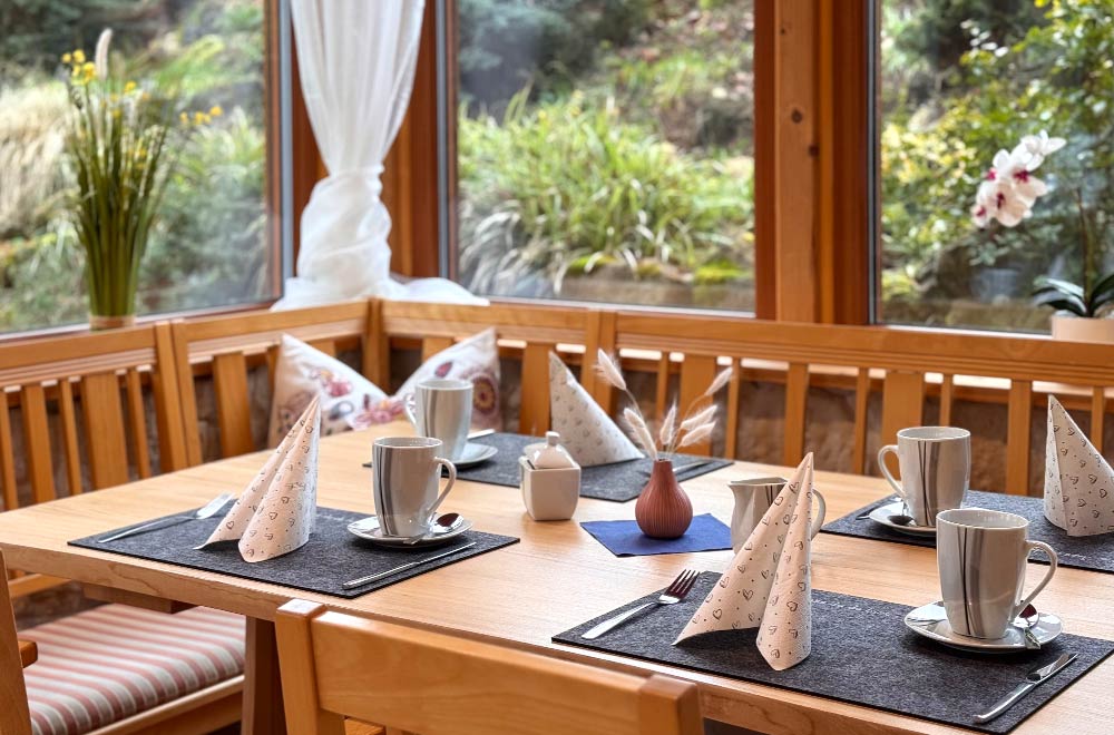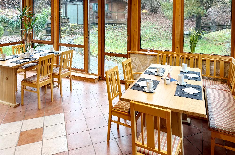 Der Tag beginnt bei uns mit einem Lächeln: Unser Team begrüßt Sie im lichtdurchfluteten Wintergarten mit Blick in den großen Garten – perfekt auch für Gäste mit Hund.