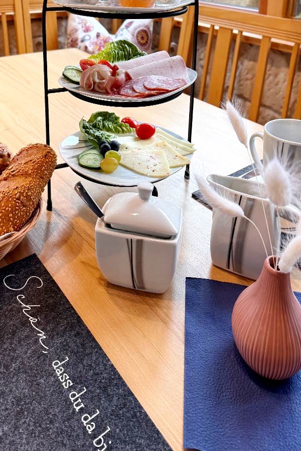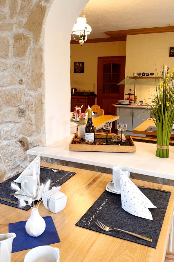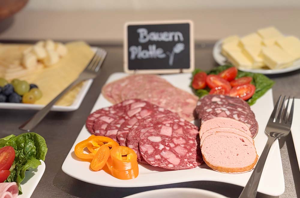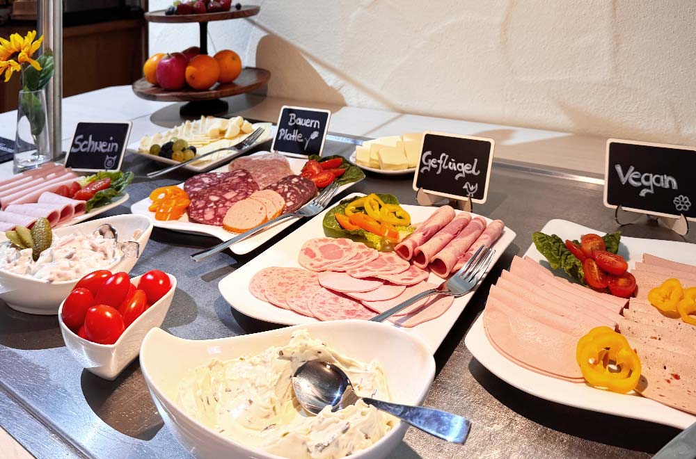 Genießen Sie unser liebevoll zusammengestelltes Frühstück. Wir verwöhnen Sie mit fränkischen Wurst- und Schinkenspezialitäten, frischen Brötchen, Käse, Joghurt, Obst, Müsli und Säften. Eierspeisen bereiten wir frisch nach Ihren Wünschen zu. Kaffee- und Teespezialitäten stehen Ihnen ganztägig zur Verfügung, ebenso wie frisches Tafelwasser.